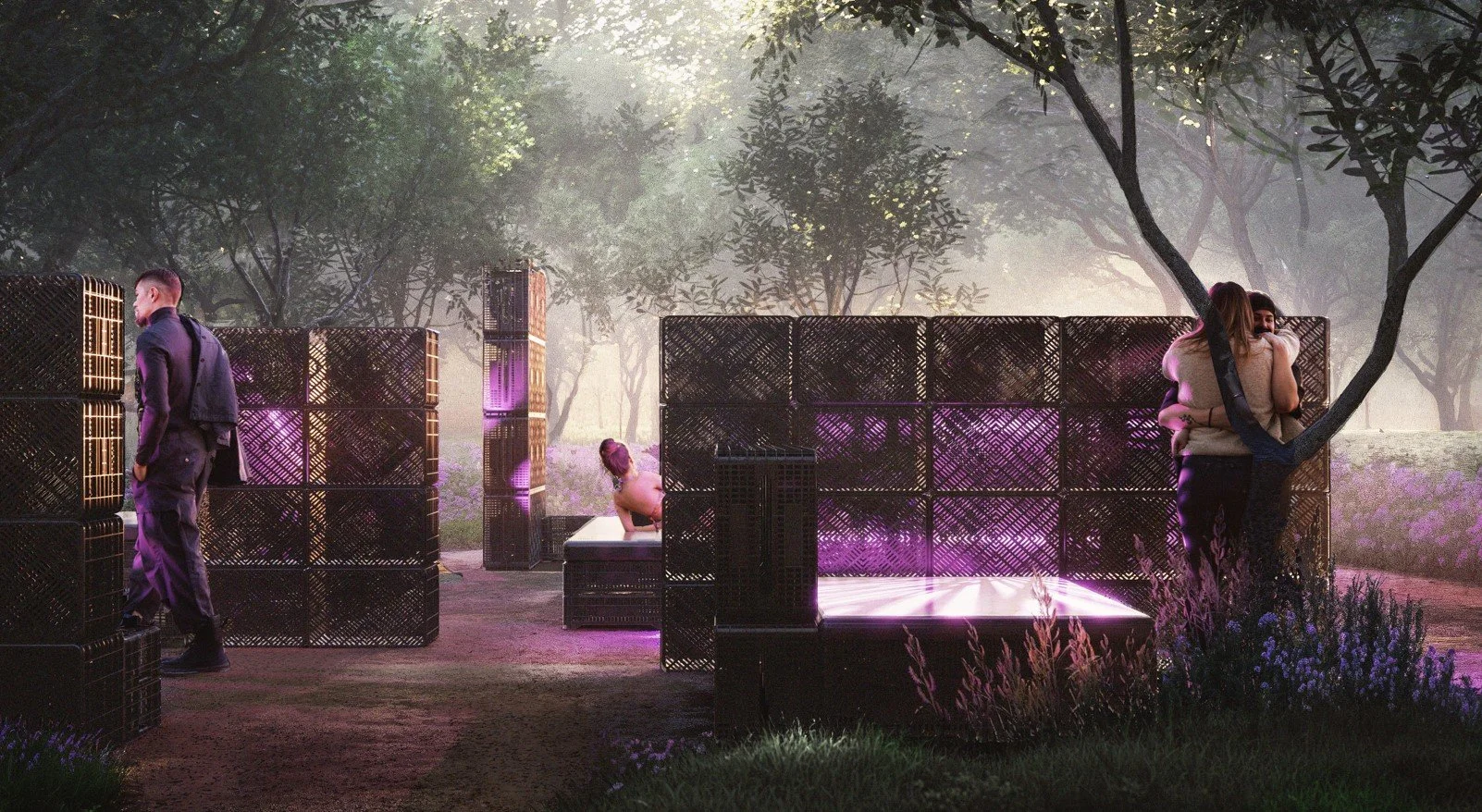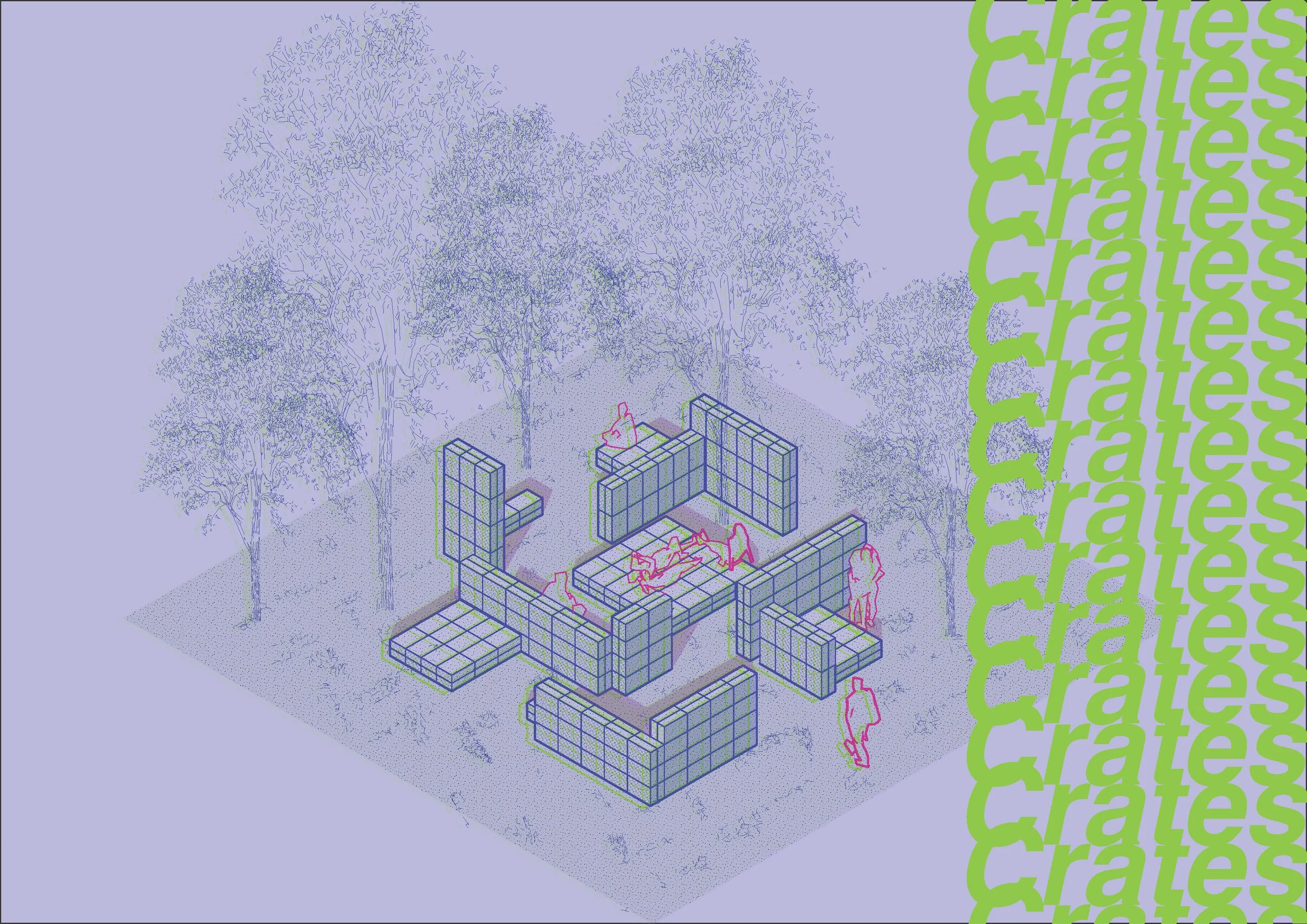 CRATE ENCOUNTERS REIMAGINES HIDDEN QUEER SPACES THROUGH A MODULAR STRUCTURE BUILT ENTIRELY FROM PLASTIC FRUIT CRATES. THIS INSTALLATION BLURS THE BOUNDARIES BETWEEN INTIMACY AND SOCIAL INTERACTION, STRUCTURE AND FLUIDITY, PRIVACY AND REVEAL.