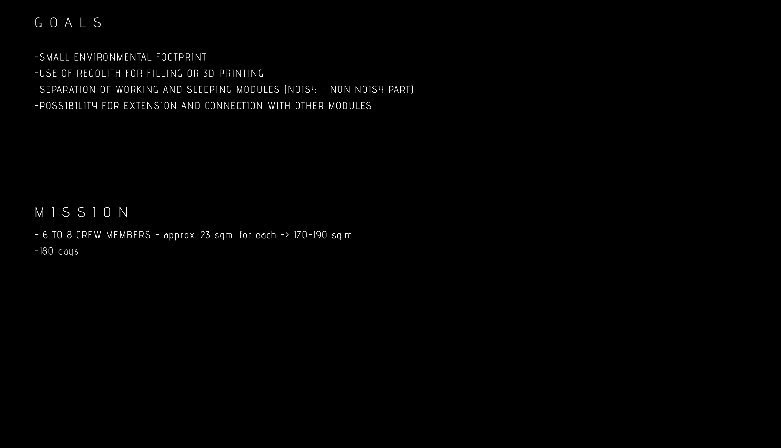 This first generative habitat deriving from this circular typology, corresponds to a mission that includes 6-8 members, with a footprint of 170-190 square meters, for a mission of 180 days.