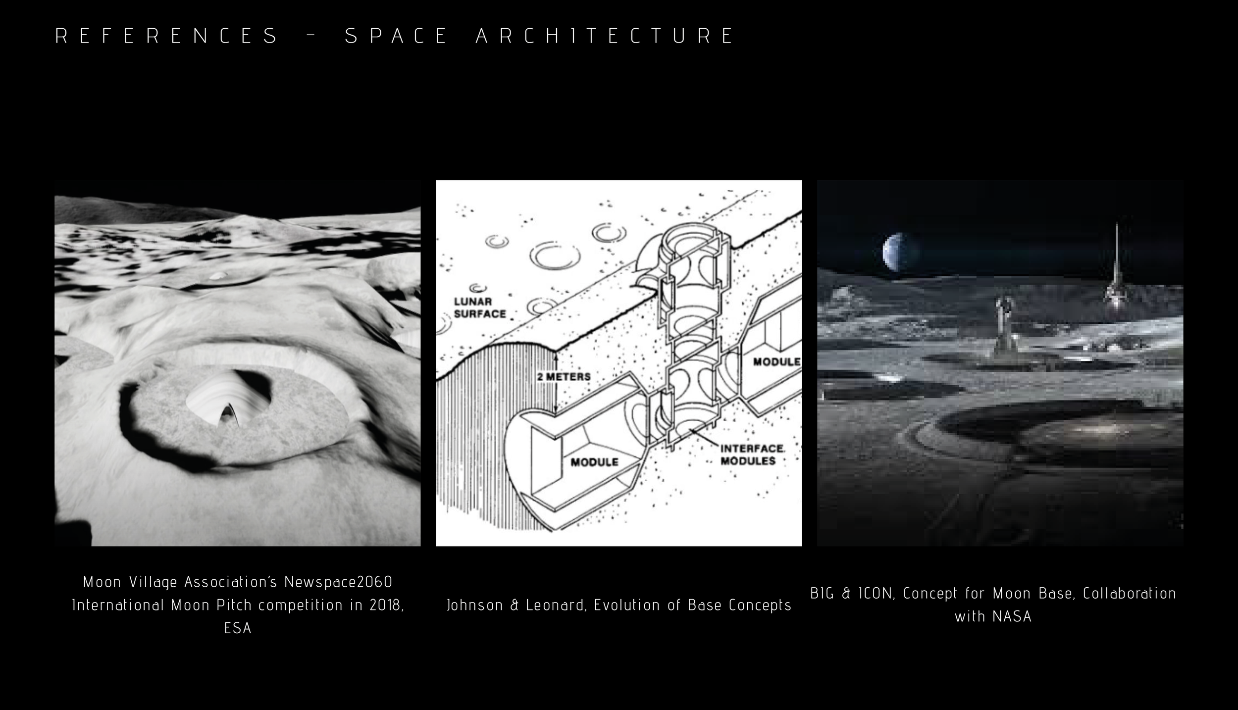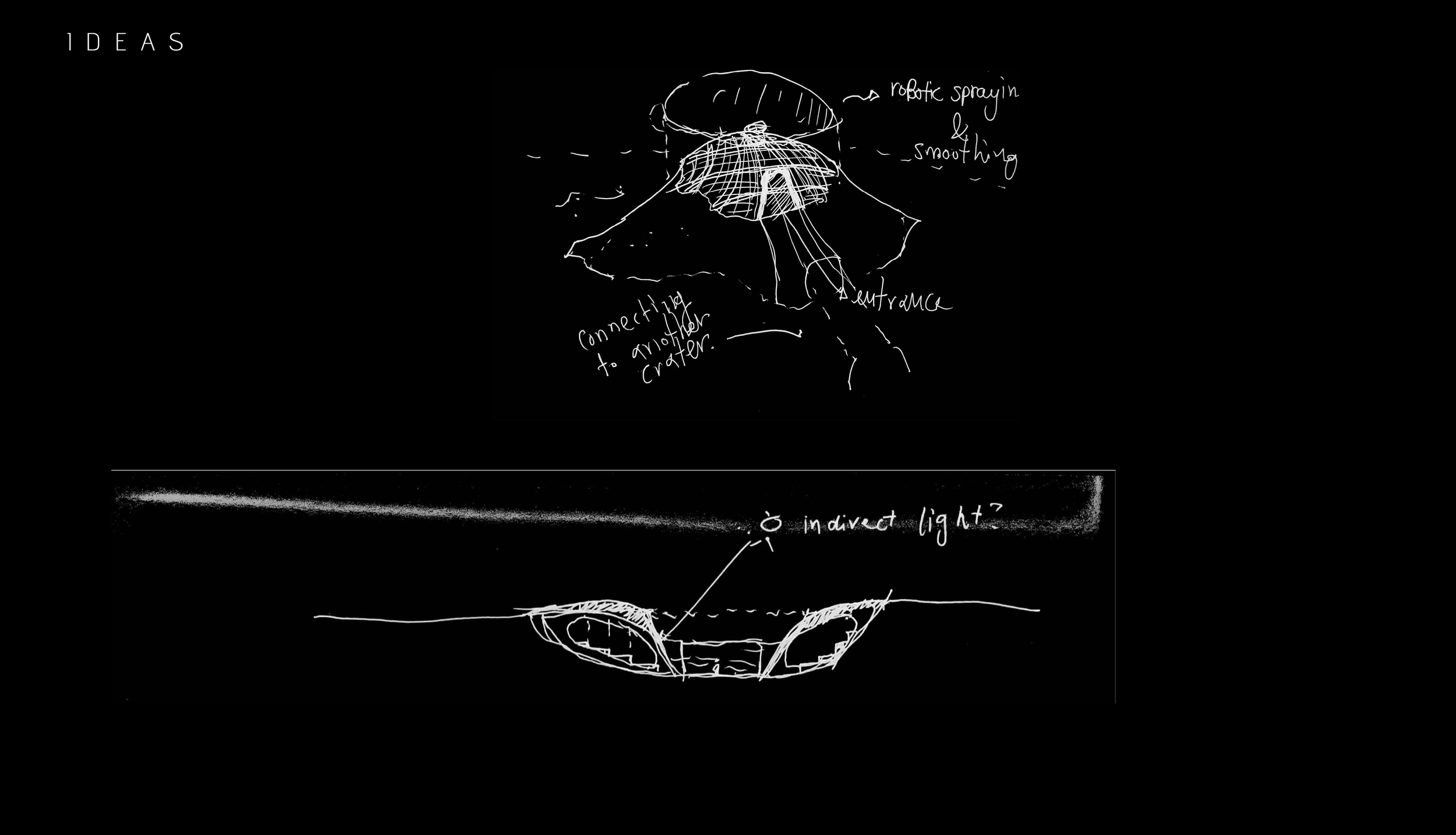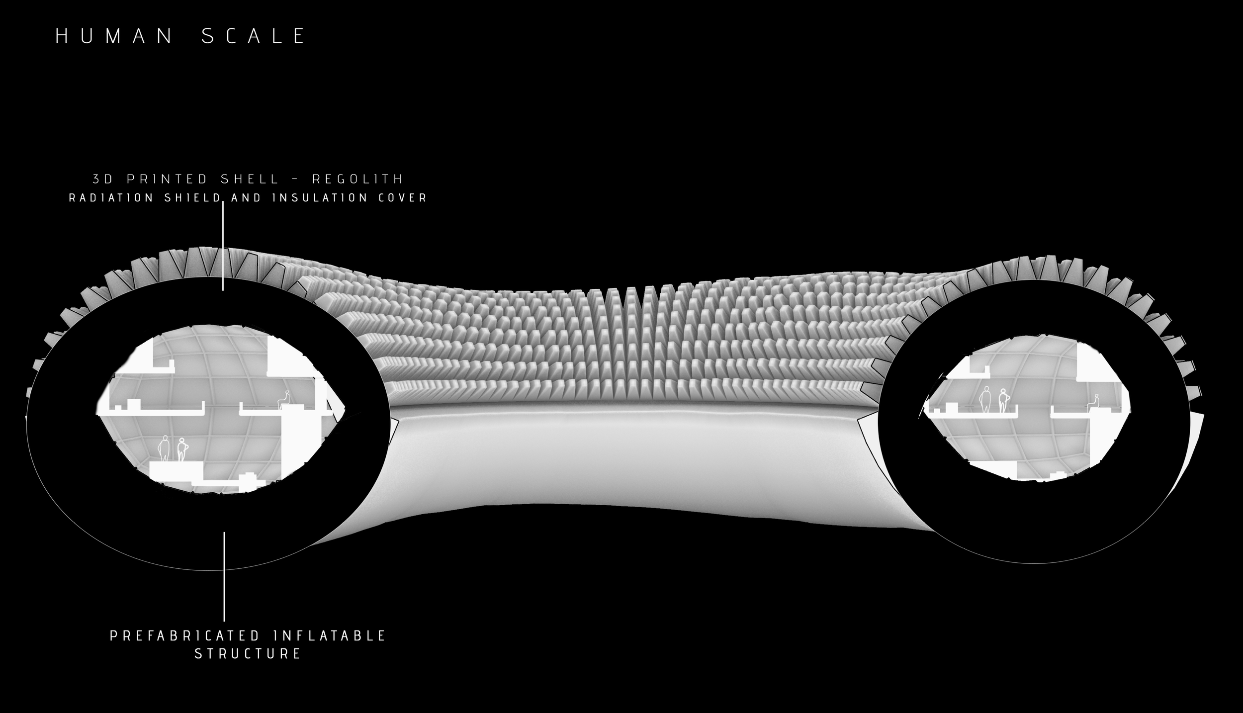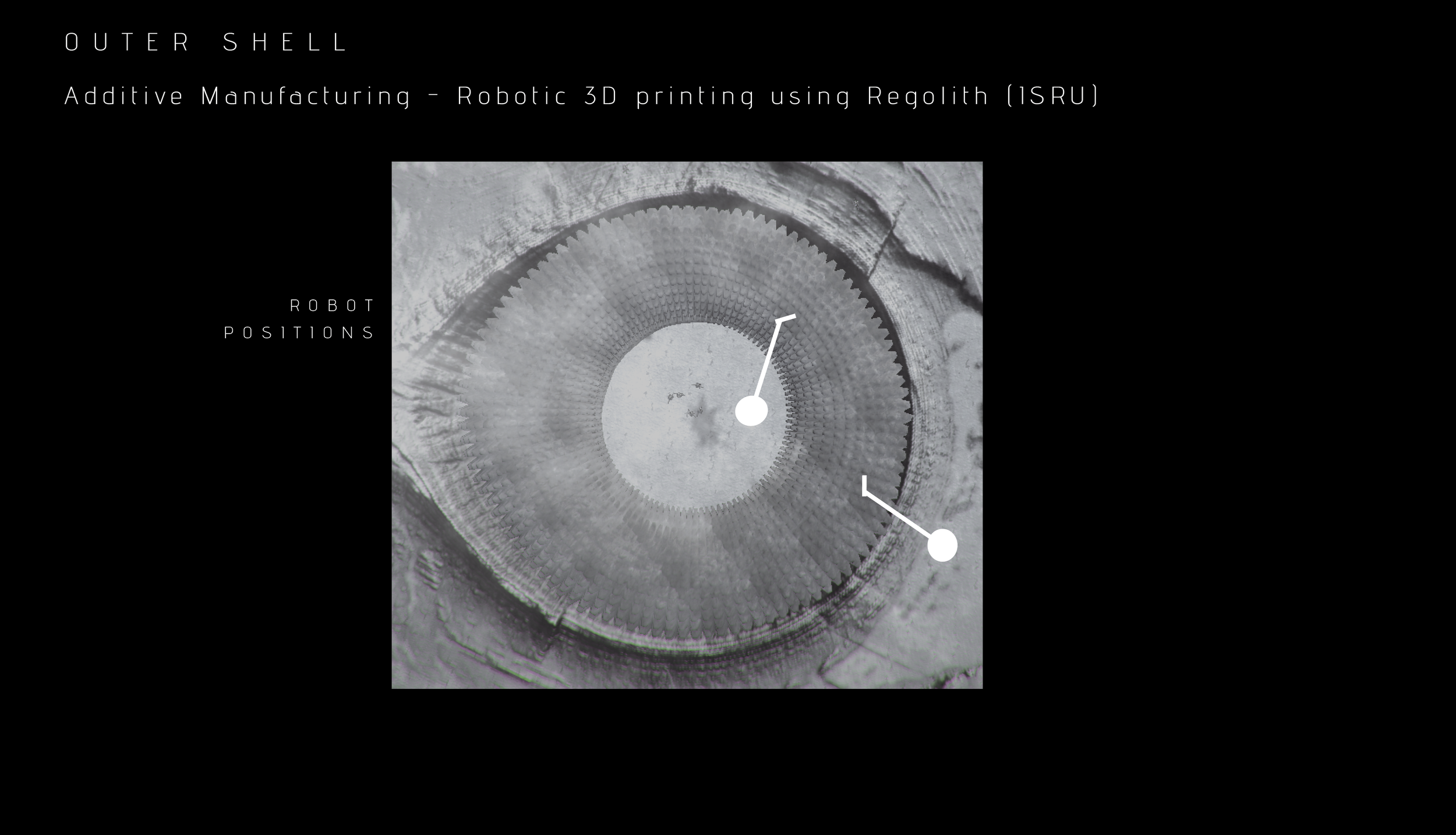 The aim is to generate a habitat typology with a small environmental footprint, taking advantage of the In Situ Resources available, such as the Moon Regolith that can be used for additive manufacturing processes like 3d printing. This fabrication process also enables freedom of form that can be adapted to irregularities and unique characteristics of the landscape, using advanced scanning methods.