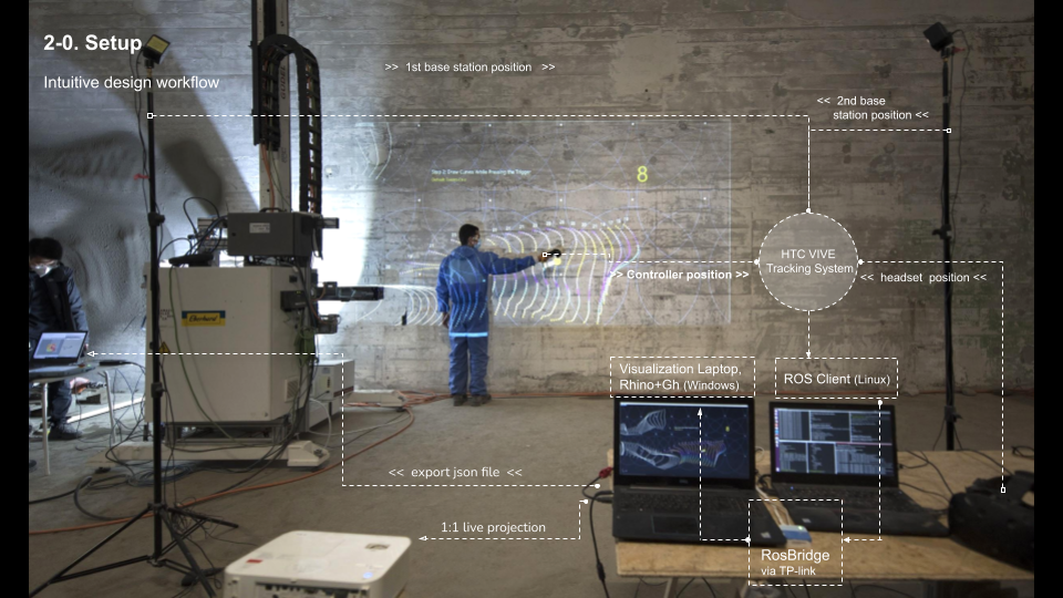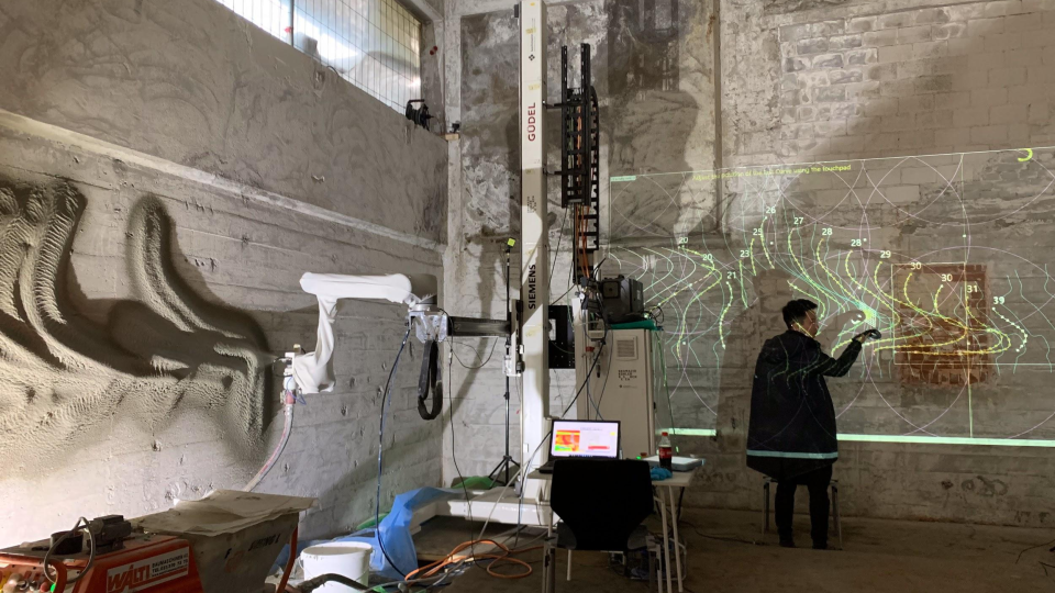 Summary: Using a Vive lighthouse environment and a hand controller, the user can design intuitively shapes on the wall. The 3D gestures and shapes are then taken into consideration and translated to robotic fabrication parameters for the robotic plaster spraying, in order to produce a continuous design with various volumetric qualities.